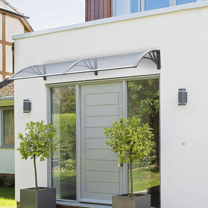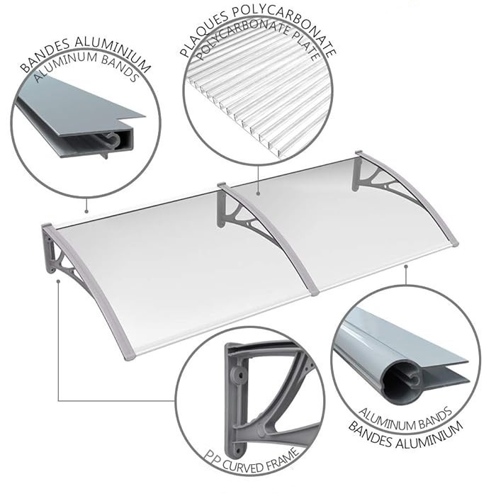 Dveřní vchodová stříška vyrobená z kvalitního čirého dutinkového polykarbonátu o síle 5 mm, s ochrannou vrstvou proti UV záření pro vyšší odolnost vůči povětrnostním vlivům, držáky vyrobené z tvrzeného plastu, krajní lišty vyrobeny z hliníku s barevným nátěrem pro zvýšení životnosti. Ideální pro ochranu vchodu Vašeho domova, kanceláře nebo nad klimatizaci, tepelné čerpadlo. Balení obsahuje 3ks konzole, 2ks polykarbonátové desky, 4ks lišt, montážní šrouby.