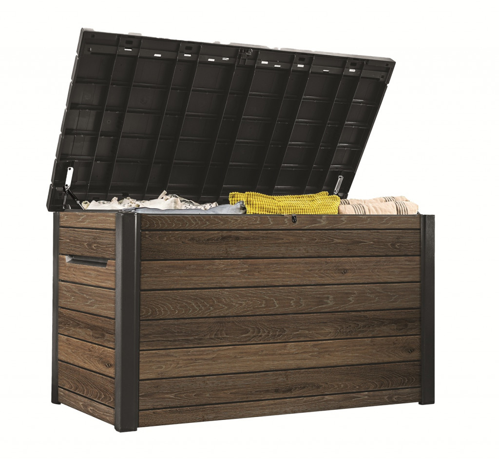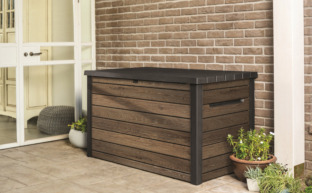 Jednotný design: Úložný box v elegantním odstínu vlašského ořechu (walnut) je součástí řady SIGNATURE, což Vám umožní sjednotit exteriér s dalšími prvky, jako je zahradní domek nebo vysoká úložná skříň či skříň na popelnice.