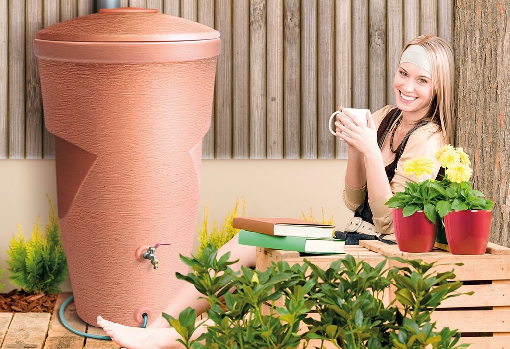 Kvalitní nádoba na dešťovou vodu určená k okapovým rýnám. Nový design této nádoby nejenže ozdobí Vaší zahradu, ale také zachytí dešťovou vodu, kterou můžete zužitkovat např. na zalévání záhonků, květináčů apod.